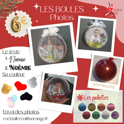 Il vous suffit de m'envoyer une photo par mail et, grâce aux options proposées sur l'affiche, vous pourrez créer une boule de Noël unique, jusqu'au choix des paillettes. Une idée cadeau originale et intemporelle, parfaite pour immortaliser chaque année l'évolution de vos enfants, de vos animaux ou de votre famille.
