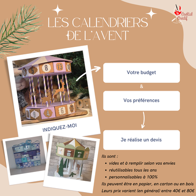 Description : Votre budget et vos idées se combinent à ma créativité pour créer un calendrier de l'Avent 100% personnalisé !
